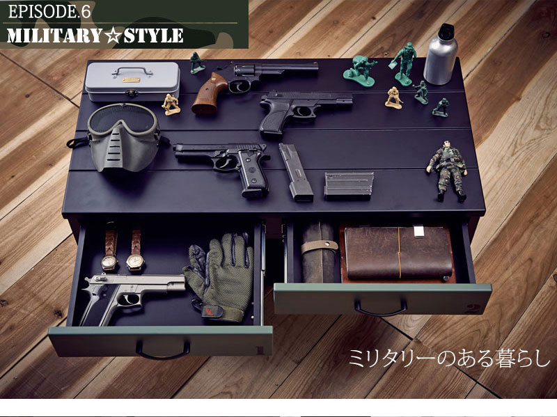 Military8シリーズとしてこのラダーラックの他に幅40cmチェスト、幅90cmチェスト、キャスター付きテーブルが製品化されています。これらは「ARMY GREEN」カラーで統一感があり揃えて活用すると部屋がミリタリー一色になり非常にかっこいいです。